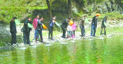 记者随行看到,金竹溪流如一条长长的玉带镶嵌在大山中,浅水区清澈见底,深水区则绿如翡翠。乡长付晓波告诉记者,当人们吃腻了网箱鱼后,野生河鱼开始走俏,金竹小溪里的鱼便被猎捕一空。为了保持生态平衡,还原溪流的原始景观,该乡此次购买了10万尾鱼苗进行了投放。同一天,该乡河道管护和野生鱼保护协会正式挂牌成立,今后,将对毒鱼、电鱼、炸鱼等破坏渔业资源的行为进行严厉打击。
