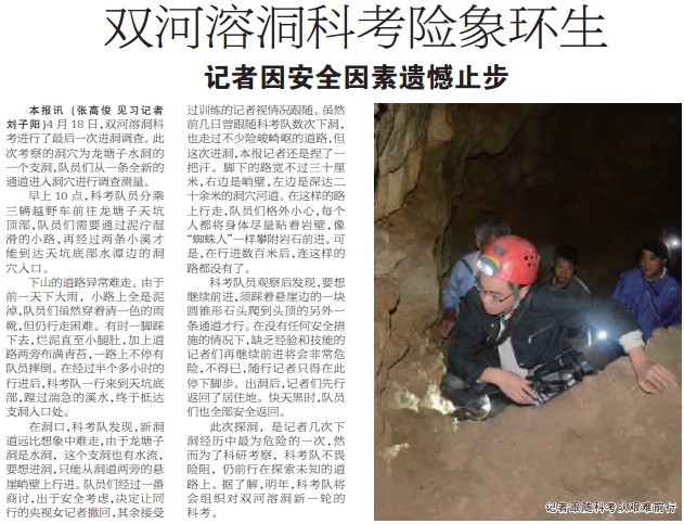 此次探洞,是记者几次下洞经历中最为危险的一次,然而为了科研考察,科考队不畏险阻,仍前行在探索未知的道路上。据了解,明年,科考队将会组织对双河溶洞新一轮的科考。(张高俊 见习记者 刘子阳)