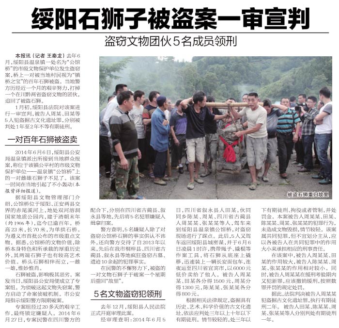 2014年6月6日,绥阳县公安局温泉镇派出所接到当地群众报案,称位于该镇公平村的市级文物保护单位——温泉镇“公馆桥”上的一对雌雄石狮子不见了。该案一时间在当地引起了不小轰动(本报曾详细报道)。