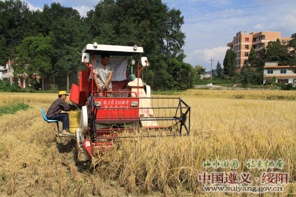 国庆长假期间,绥阳县广大农民群众抢晴天战阴天,利用老式的挞斗、脚踏式收割机、柴油收割机、大型的联合收割机收割稻谷,做到颗粒归仓。