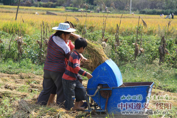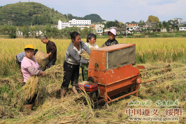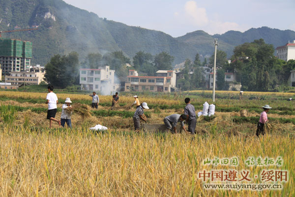 今年,绥阳县水稻播种和移栽期间均受到阴雨天气的影响,种植比往年晚了10天左右,在后期生长时又受到干旱,但绥阳县各级有关部门充分发挥职能作用,指导农民群众加强田间管理和及时提供农时服务,使得水稻长势较好,获得丰收。由于中秋节期间连绵10来天的阴雨天气,使得今年的稻谷晚收,10月3日天气放晴后,全县平坝和高山地区广大人民群众开始抢收稻谷,在平坝地区,广大农民群众邀朋唤友,互相帮助,运用人工踩踏式和用柴油机代替的自动化及现代化的大型收割机械进行收割,四个万亩大坝上一片忙碌,车载人背肩挑齐上阵,来往穿梭的人们脸上写满了笑意。在高山地区,由于受到地理环境的限制,大型机械收割机无法进入,老式的挞斗还是收割的主要工具,但人民群众结成对子,互相帮助,男女老少学生齐上阵,也有部分群众购买了小型脚踩式和用柴油代替的挞谷机,尽管人手少,但收割的速度也较快。
