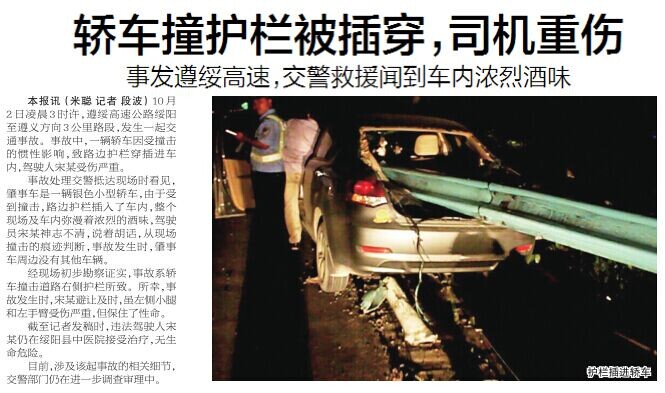 遵绥高速公路轿车撞护栏被插穿,酒驾司机重伤
