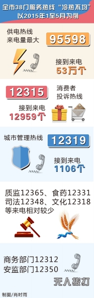 来自市委群工办的数据显示,目前我市辖区内,共有中央、省、市党政部门、群团组织、事业单位和国企公布的非紧急服务热线电话38门,其中,35个属于各级地方党委政府、行业类热线,3个属于国企、民生类服务热线,而能够正常接通的有31个。由于服务对象不同,我市38门服务热线呈现出“冷热不均”的现象。
