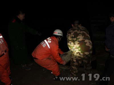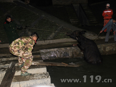 1月22日20时,贵州省遵义绥阳县洋川镇圆音寺村,一村民赶耕牛回家,经过洋川河时,两头耕牛一前一后失足跌入河道中。村民在河堤上牵着牛转了一圈,都未能发现上岸的路口,在寒冷的河水中,耕牛不断发出凄惨的叫声。村民赶紧回村找人帮忙,可当村民赶到现场时发现,凭他们自身的条件和工具根本无法将耕牛救出,无奈之下只好拨打119求助。