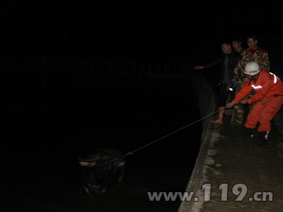 图为消防官兵合力搭救落水耕牛