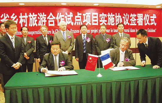 该协议是根据法国旅游局和中国国家旅游局在2007年6月11日签署的2007-2011年的工作计划、罗泽尔省和贵州省2001年的合作伙伴协议、2006年9月6日乡村旅游国际论坛(贵阳宣言)关于发展乡村旅游、保护文化物质遗产的声明等有关精神签订的。图为双方在协议上签字。